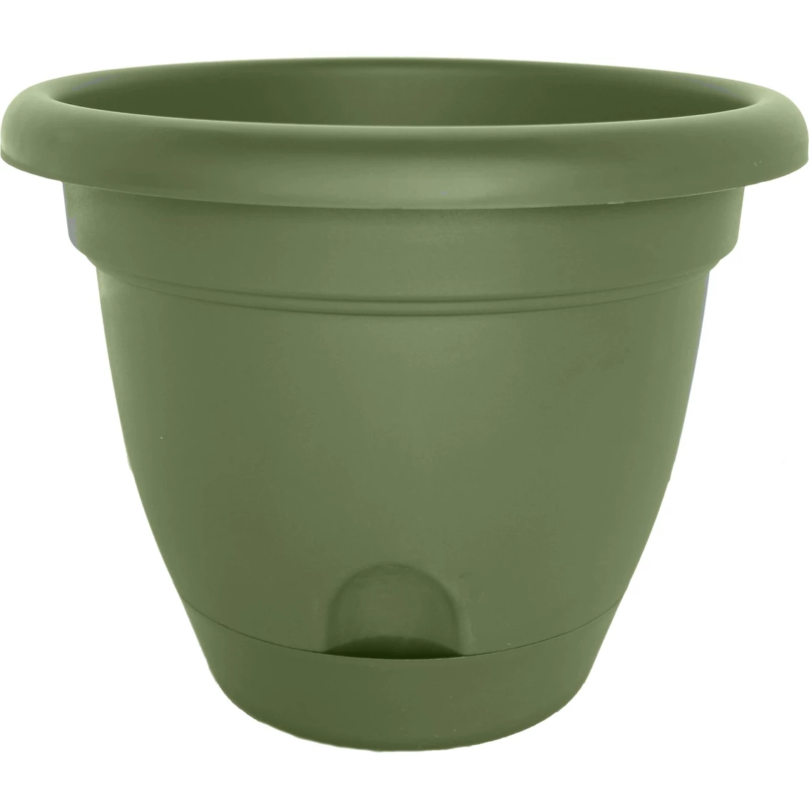 The 12 in. Lucca Planter from Bloem has an attached redesigned saucer and self-watering feature. Rolled rim. Model: 100541836.