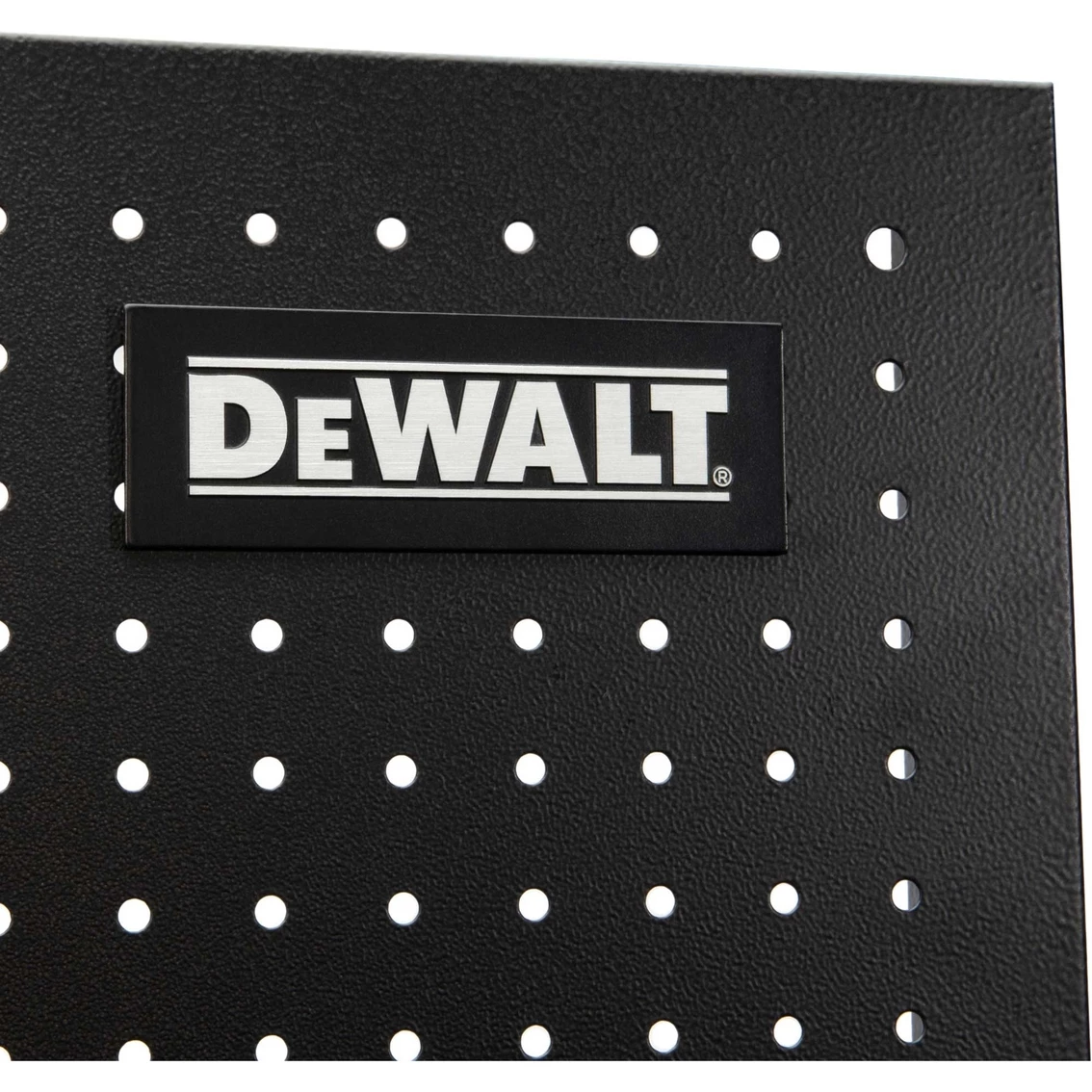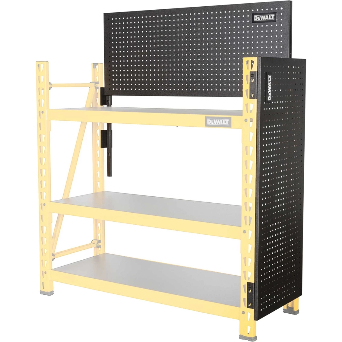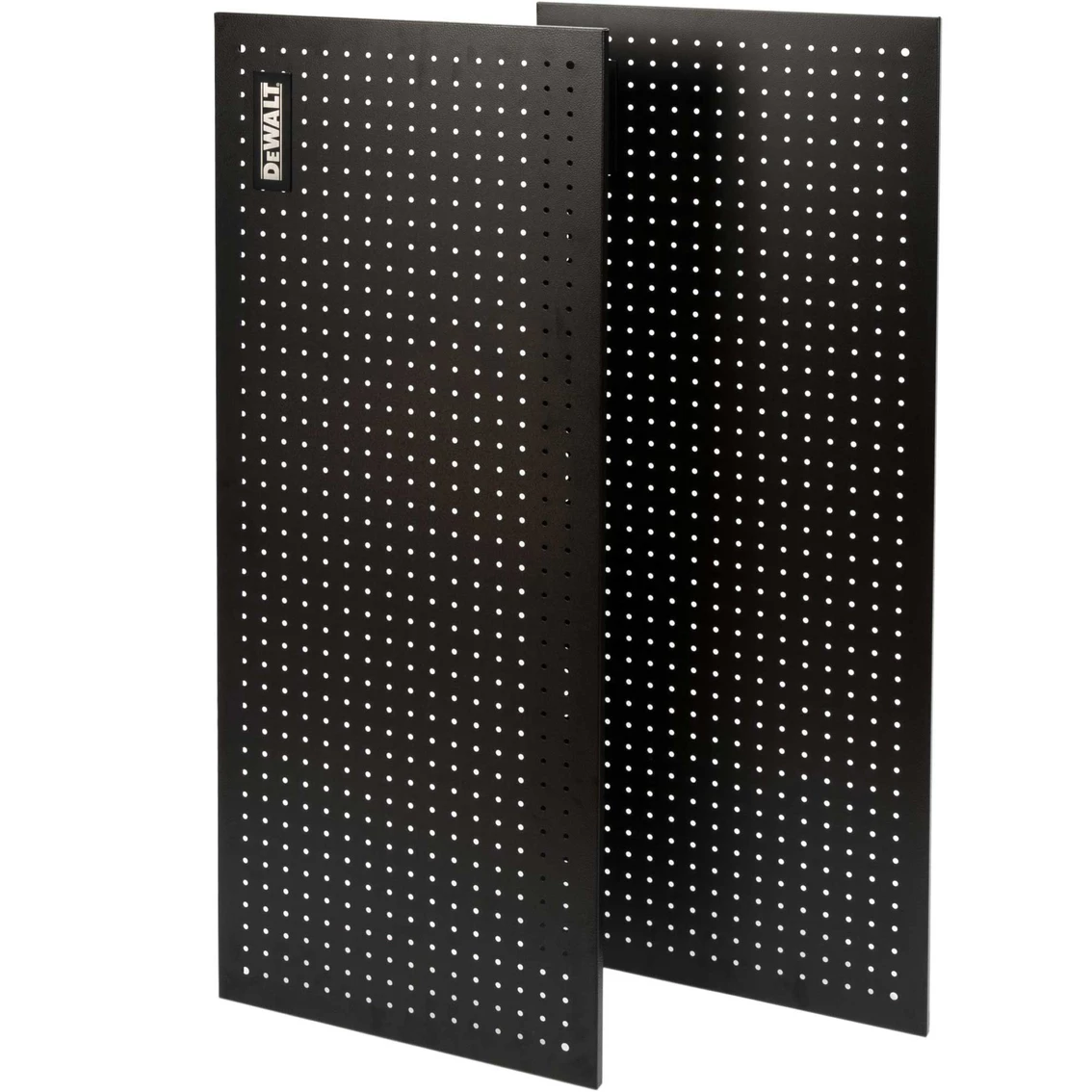Expand the storage capacity of your existing DeWalt storage rack with the DXST4500PBK 2 pc. Pegboard Kit. Made to match the dimensions of the DXST4500 4 ft. storage rack, it shares some of the same innovative features and adds a few of its own. Each 18-in. x 44-in. panel is made of durable steel which is then given an industrial grade black powder-coating that matches the appearance and texture of the existing laminate wood composite decking on the 4 ft. storage rack. The pegboard kit contains two sets of mounting brackets to let you attach the panels to sides or back of the rack in one of several configurations. You can use them either with one panel mounted on each side, with both panels stacked vertically and attached to the back, or with one on a side and one on the back. To keep the panels in place once attached, they use the same locking pins as the racks to secure the mounts to the rack uprights and prevent them being knocked loose by accidental impacts. The panels feature standard 1-in. on center hole spacing with 1/4-in. diameter holes to fit most pegboard accessories. Thanks to their steel construction, the panels let you use a variety of magnetic storage accessories as well, accessories that won’t work with regular wood and resin composite pegboards. Model: 41557.