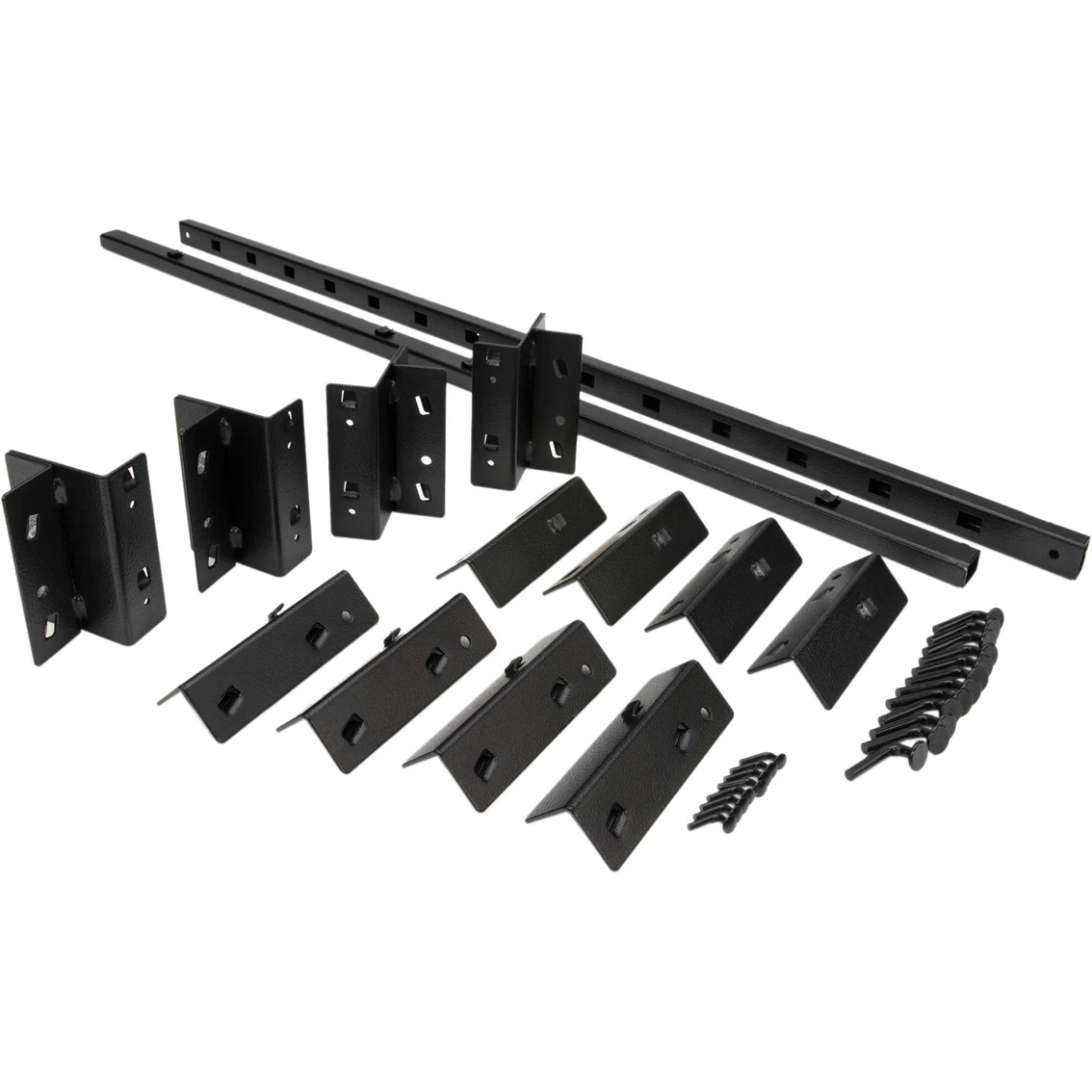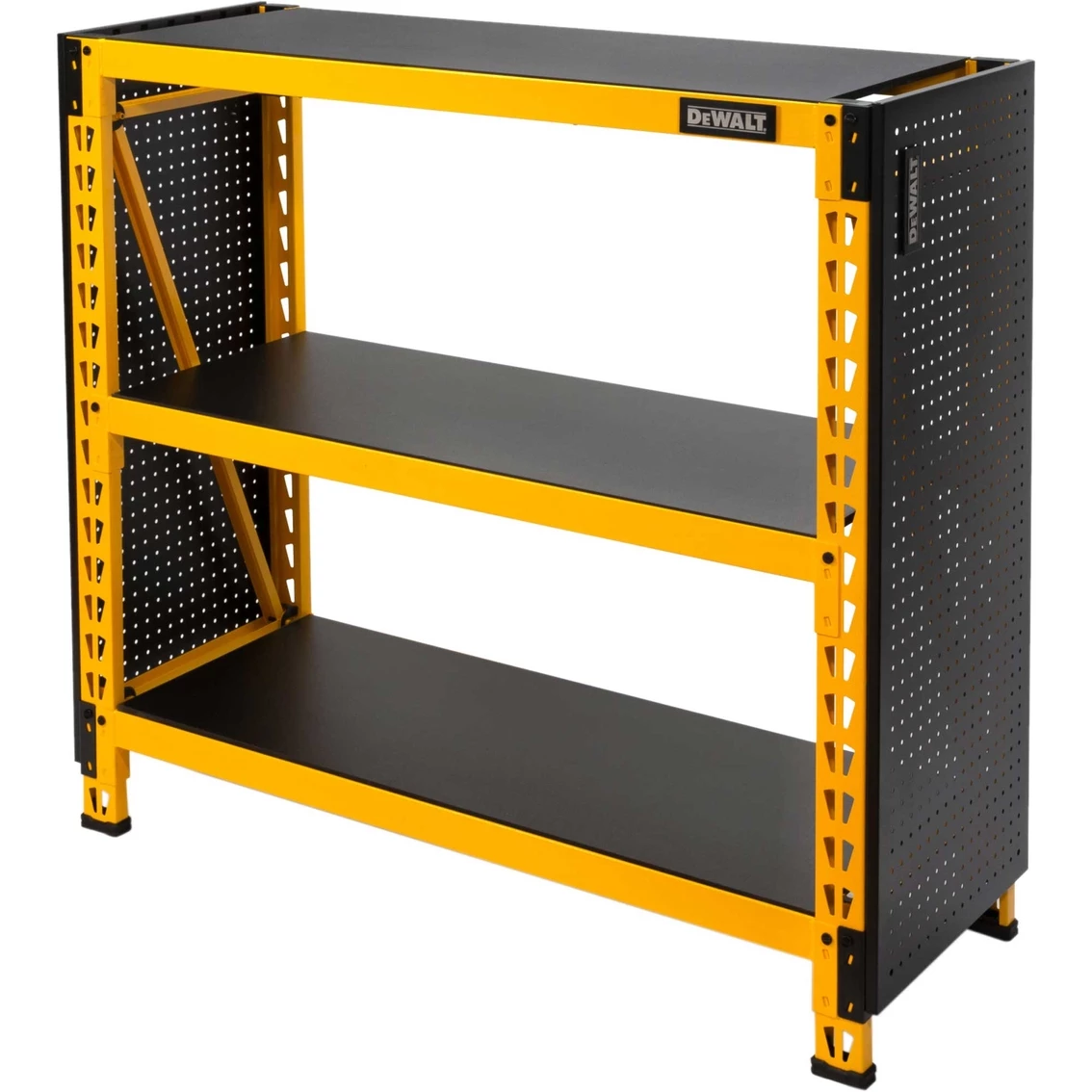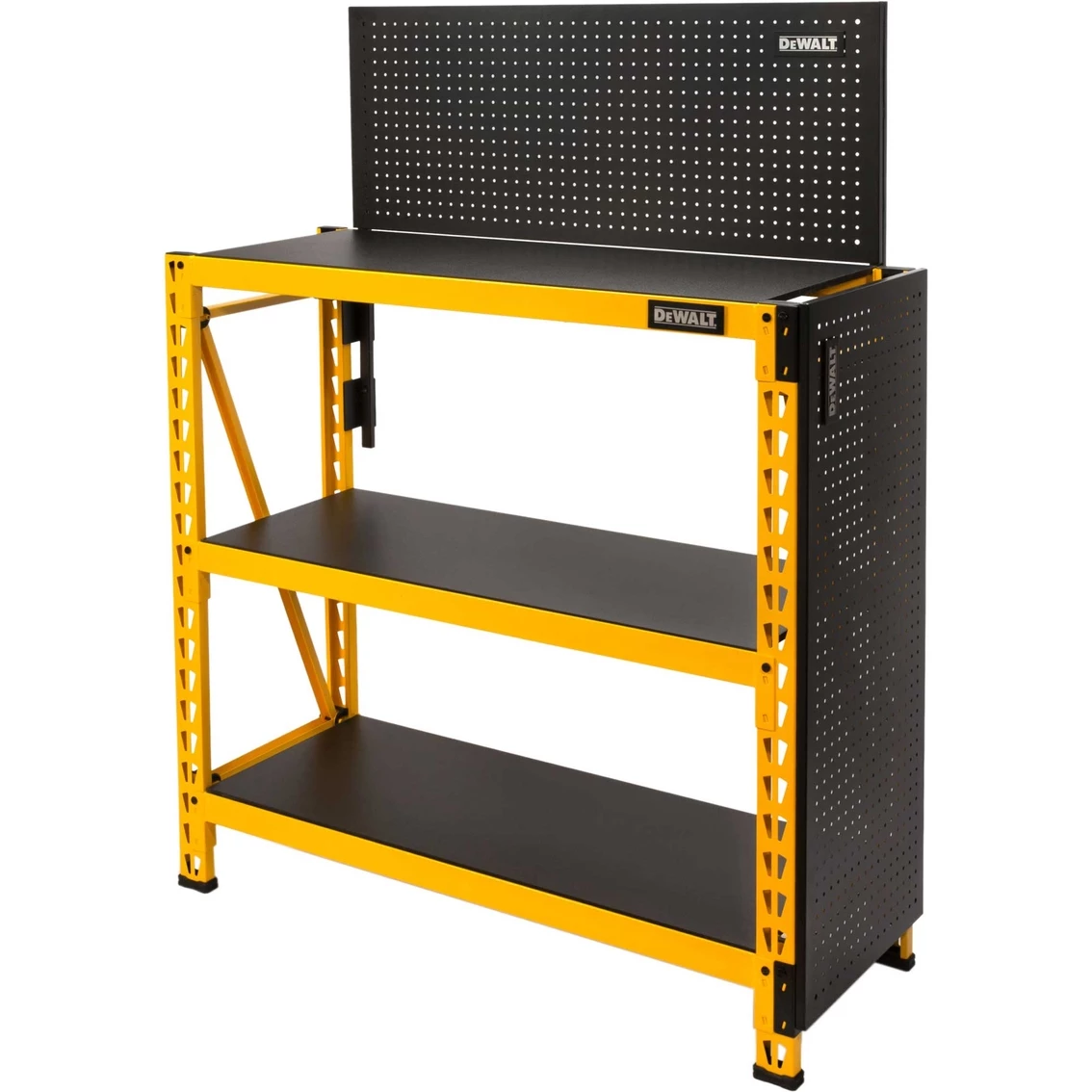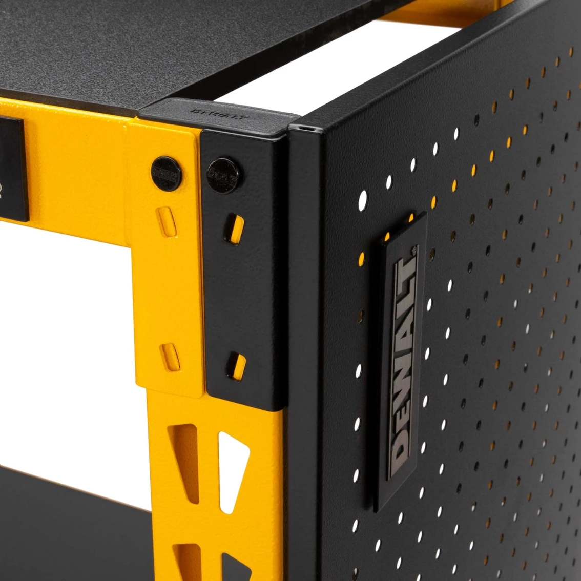 Expand the storage capacity of your existing DeWalt storage rack with the DXST4500PBK 2 pc. Pegboard Kit. Made to match the dimensions of the DXST4500 4 ft. storage rack, it shares some of the same innovative features and adds a few of its own. Each 18-in. x 44-in. panel is made of durable steel which is then given an industrial grade black powder-coating that matches the appearance and texture of the existing laminate wood composite decking on the 4 ft. storage rack. The pegboard kit contains two sets of mounting brackets to let you attach the panels to sides or back of the rack in one of several configurations. You can use them either with one panel mounted on each side, with both panels stacked vertically and attached to the back, or with one on a side and one on the back. To keep the panels in place once attached, they use the same locking pins as the racks to secure the mounts to the rack uprights and prevent them being knocked loose by accidental impacts. The panels feature standard 1-in. on center hole spacing with 1/4-in. diameter holes to fit most pegboard accessories. Thanks to their steel construction, the panels let you use a variety of magnetic storage accessories as well, accessories that won’t work with regular wood and resin composite pegboards. Model: 41557.