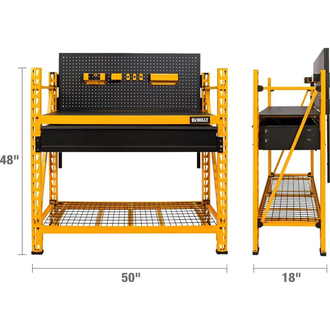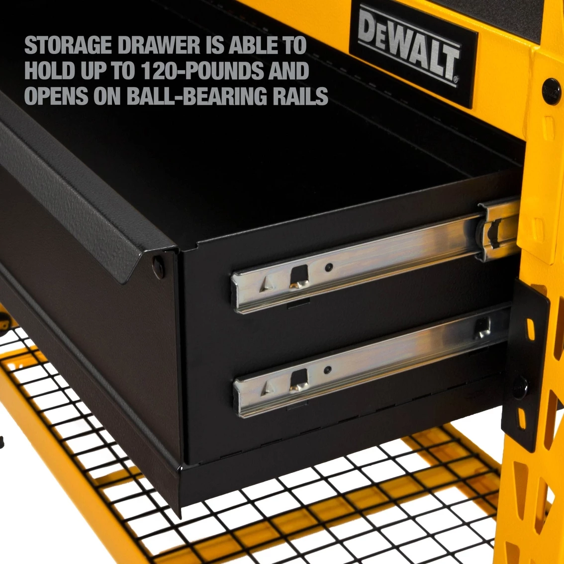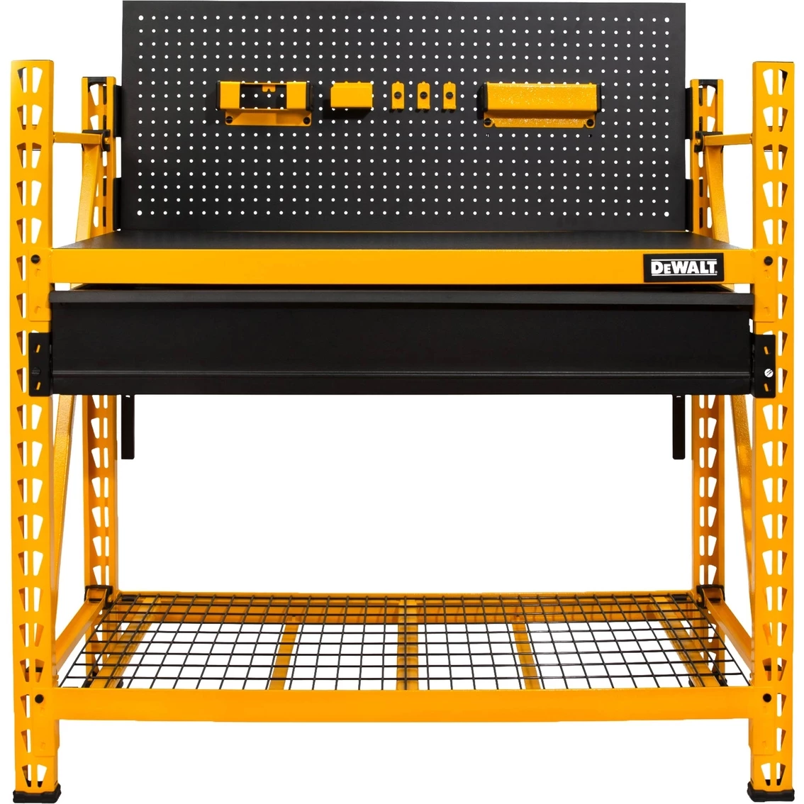 The DeWalt DXST3000WB 2-Shelf Industrial 4 ft. Storage Rack Work Station Kit contains everything you need to create the ultimate custom storage and work station. Featuring a durable steel frame given an industrial grade powder-coating, this kit contains both a composite and a wire grid shelf that are each rated to support up to 1,500-pounds of evenly distributed tools and equipment for a total capacity of 3,000-pounds. In addition to the two shelves, this kit includes an under-shelf storage drawer whose capacious interior is able to hold up to 120-pounds of tools and opens easily on smooth gliding ball-bearing rails. The steel pegboard panel mounts directly to the uprights and the kit includes six tool holders to help organize and store your most often needed tools within easy reach. Locking pins secure the shelf crossbeams and mounted accessories in place preventing them being easily knocked free until you want to reposition them. Glass-filled nylon feet on the uprights protect the powder coat from damage when repositioning the workstation in addition to providing a second layer of protection against unwanted moisture and liquid spills and protecting finished flooring from damage. Model: 41631.