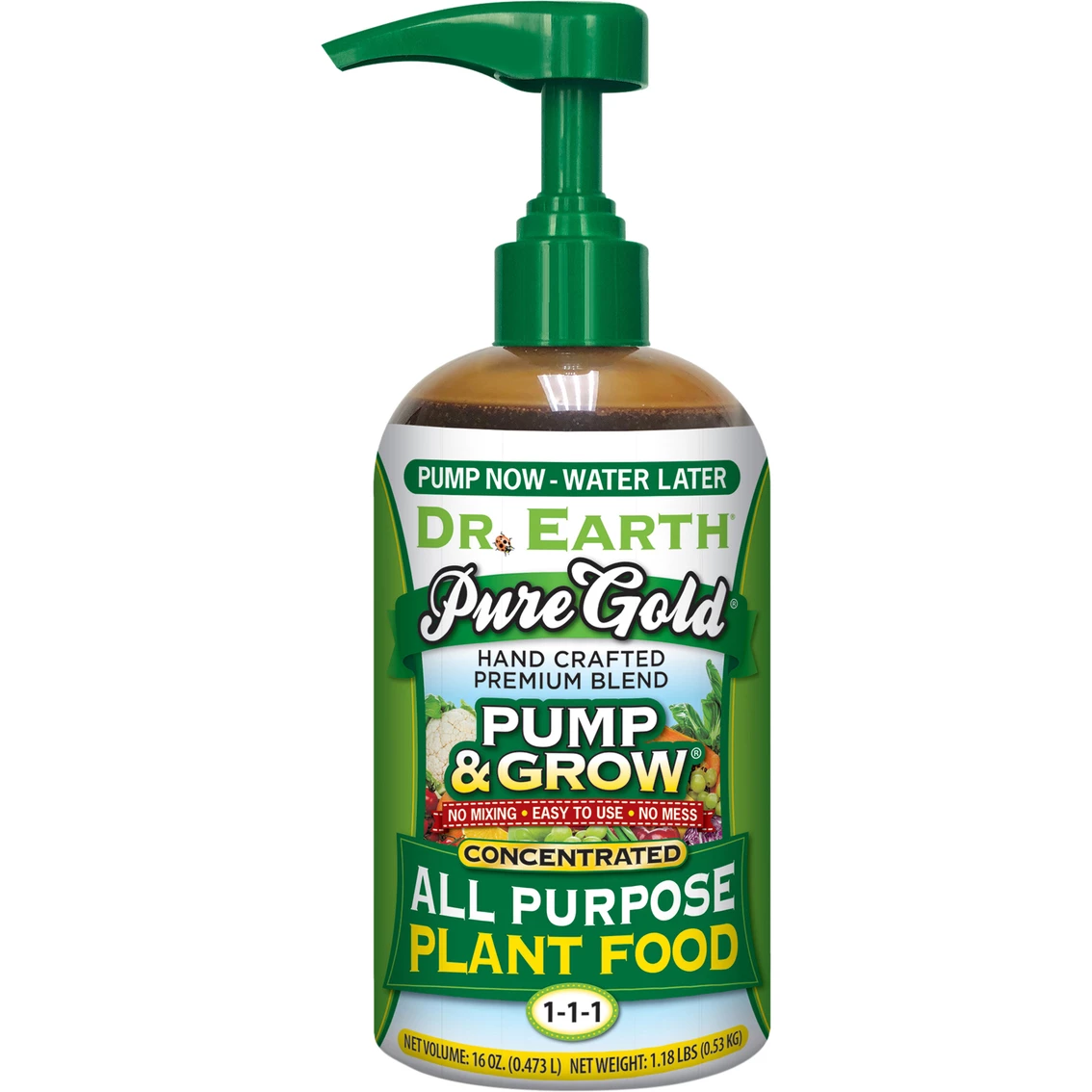 Now you can easily fertilize all of your potted plants with Dr. Earth Pump and Grow Pure Gold All-Purpose Plant Food. Simply pump the fertilizer directly onto the soil and then water in. No more need for measuring cups, diluting or mixing. This organic and natural fertilizer is people and pet safe. Dr. Earth makes it as simple as Pump and Grow. 16 oz.