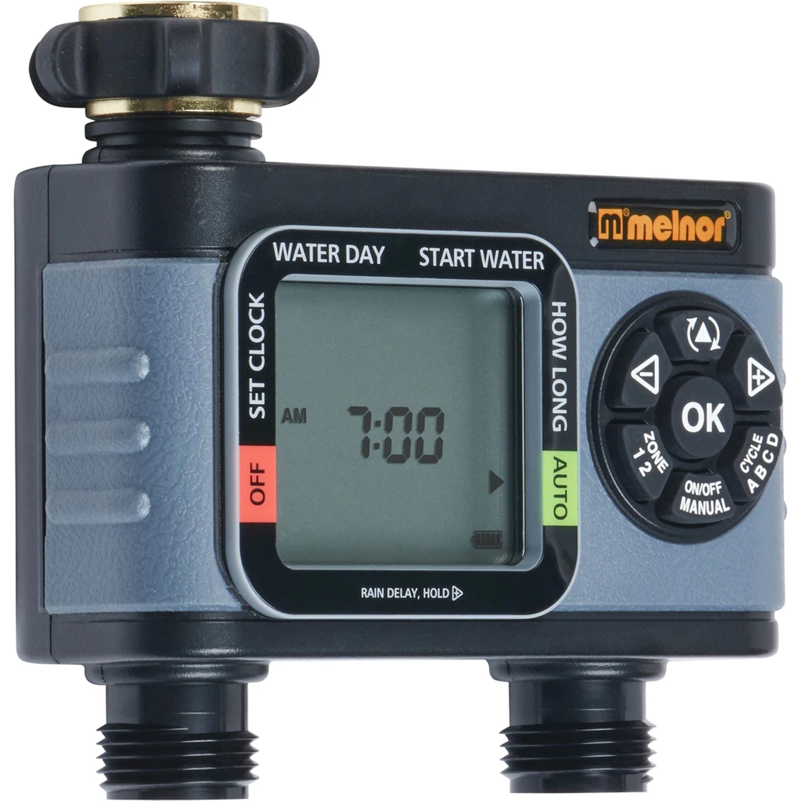 Keep your lawn healthy and the garden green with the Melnor 2-Zone Hydrologic Digital Timer. Water when you want by selecting up to four independent start times on each valve. Water on specific days of the week, or every few days, depending on your plant’s needs. Avoid wasting water when it rains with the handy rain delay to pause the watering schedule for up to 7 days; the previous settings will automatically resume when the delay is over. Need to wash the car or spray off the walkway? Manual mode allows you to turn on the water whenever you need it. Each zone works like a separate timer, so the garden can be watered every morning while the lawn sprinkler comes on every few days.