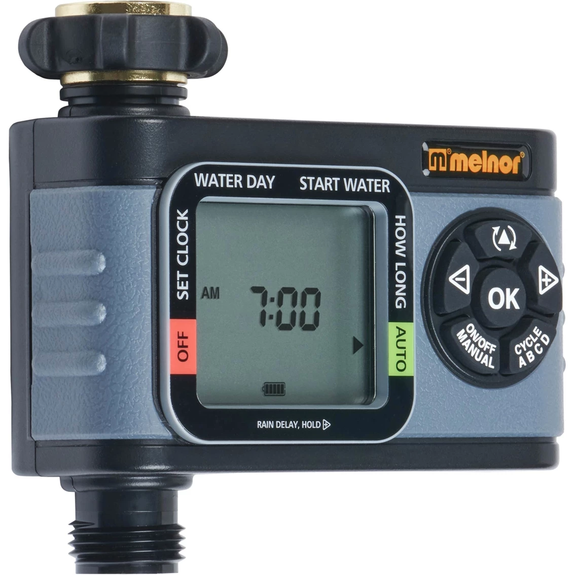 Whether you are busy at home or away for the weekend, make sure your watering always gets done with a Melnor Digital Water Timer. Set up to four individual start times to schedule watering exactly when you want. Water on specific days of the week or every few days. Avoid wasting water when it rains with the handy rain delay to pause the watering schedule for up to 7 days. Need to use to faucet? Manual mode allows you to turn on the water whenever you need it.