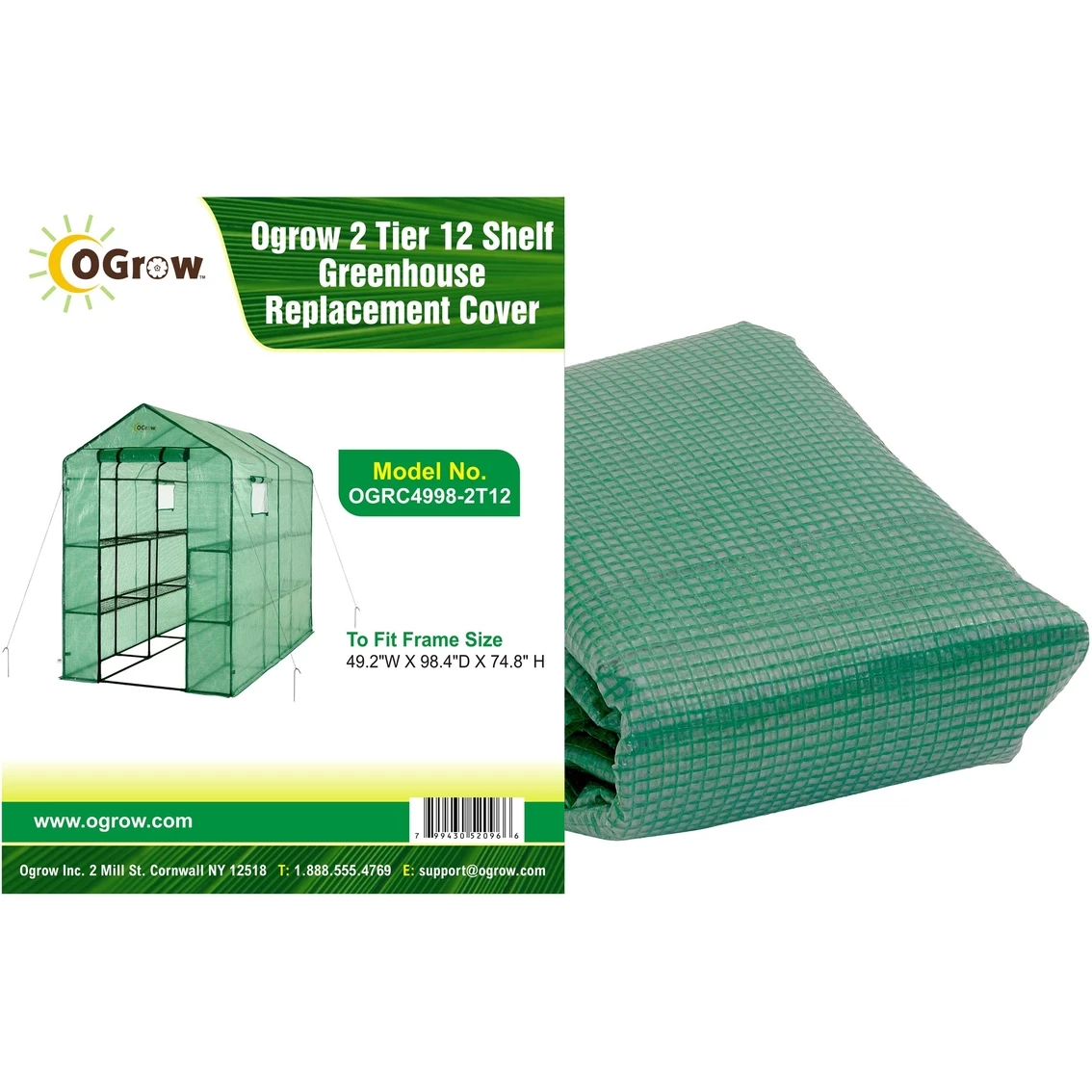Don’t let the damage of your greenhouse cover mean that you have to buy a whole new greenhouse. Ogrow heavy duty reinforced green polyethylene replacement cover will enable you to continue your plantings in no time! UV protected cover with zips for easy access and ventilation. Complete with Hook and Loop connection for greater stability when attached to wall. Fits Ogrow 2 Tier 12 Shelf Greenhouse or Greenhouse frame size measuring 49.2 in. W X 98.4 in. D X 74.8 in. H. Model: OGRC4998-2T12.
