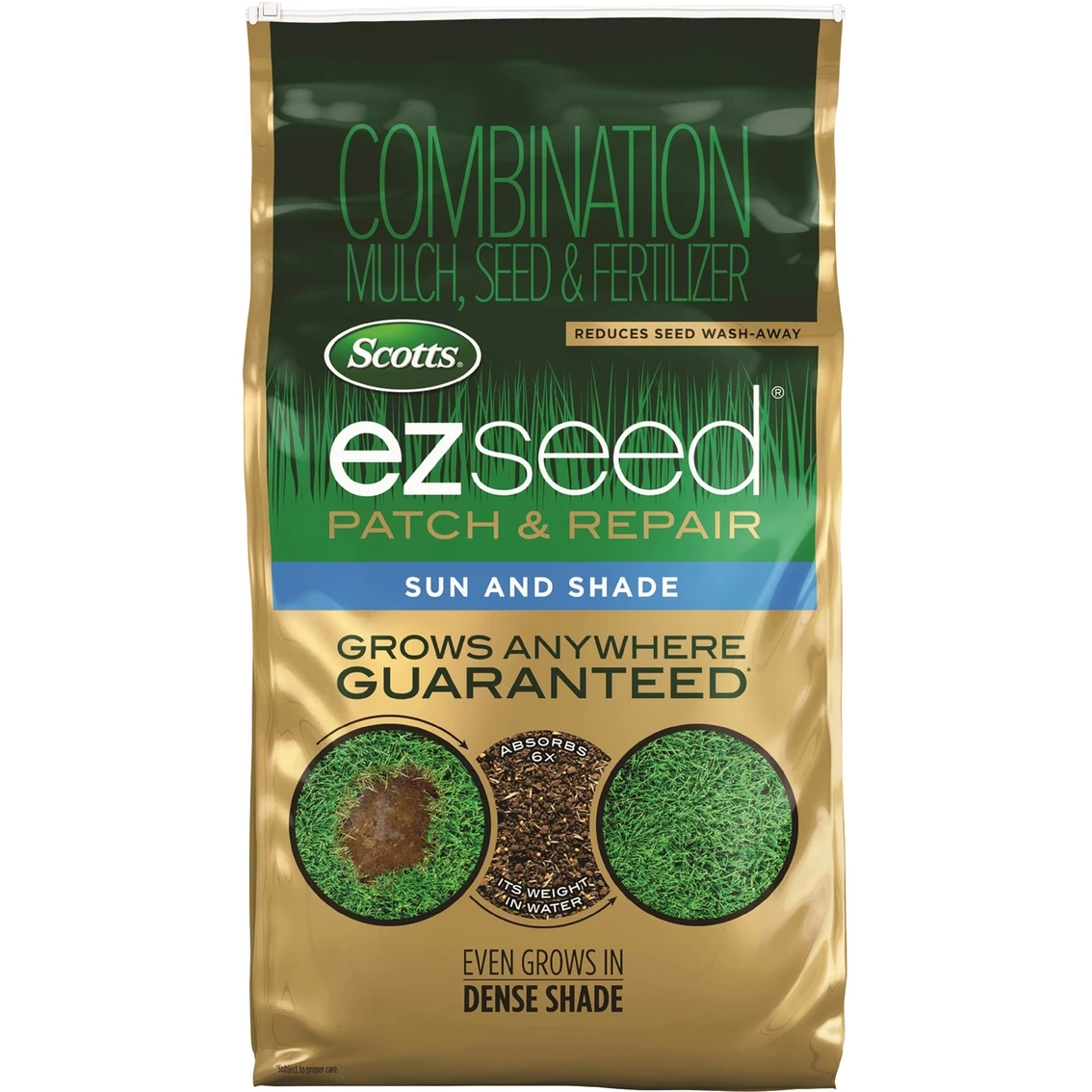 Scotts EZ Seed Patch and Repair Sun and Shade is a revolutionary seeding mix that guarantees seeding success! The unique combination of Scotts high-performance seed, premium continuous release lawn food and Scotts super-absorbent growing material, make it possible for grass to grow anywhere, guaranteed! (Subject to proper care.) Scotts EZ Seed has a tackifier to reduce seed wash away on sloped areas of your lawn. Mulch absorbs 6X its weight in water and expands to surround the seed in a moist protective layer. Exclusive controlled release fertilizer technology feeds seedlings to jumpstart growth. Location restrictions apply.