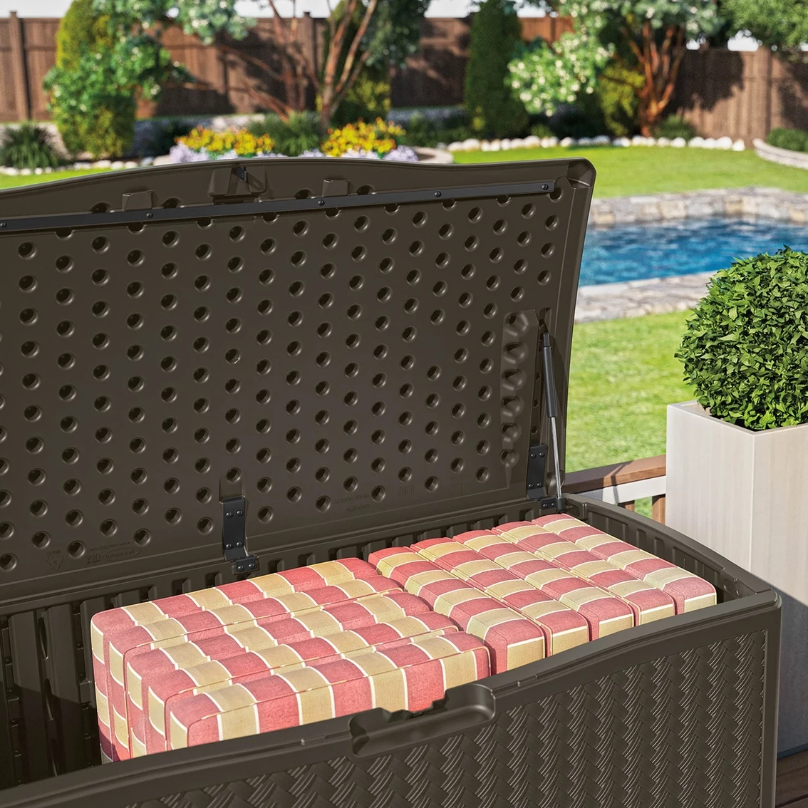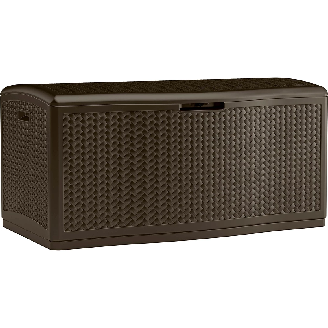 Constructed of durable double wall resin, this deck box from Suncast is great for storing furniture cushions and other outdoor accessories. The secure assembly requires minimal tools. Its latching padlock ready lid has a double piston closure (padlock not included). This deck box is long lasting with its double wall resin construction and is easy to maintain. The deck box can even be used as an additional seat on your patio! Contemporary mocha color herringbone pattern. Secure assembly requires minimal tools. Capacity: 124 gal. Model: BMDB12000.