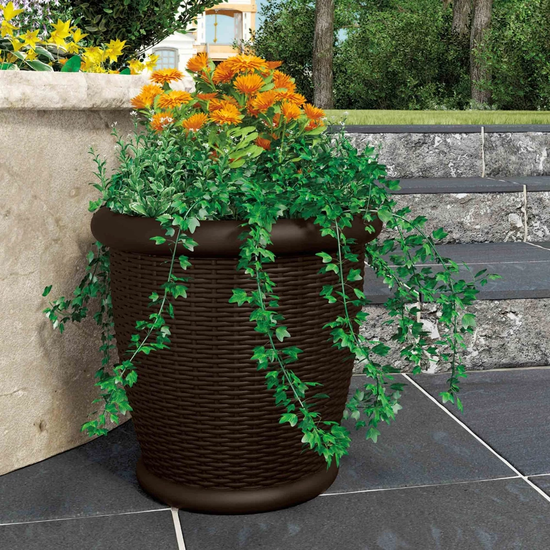 The Suncast Willow resin planter will make a beautiful addition to any home or patio. Willow Resin planter is intended for small plants and arrangements. This durable planter will hold up to any weather conditions, is UV protected to eliminate fading in the sun and is resistant to chipping and cracking. Model: 1816WJ2.