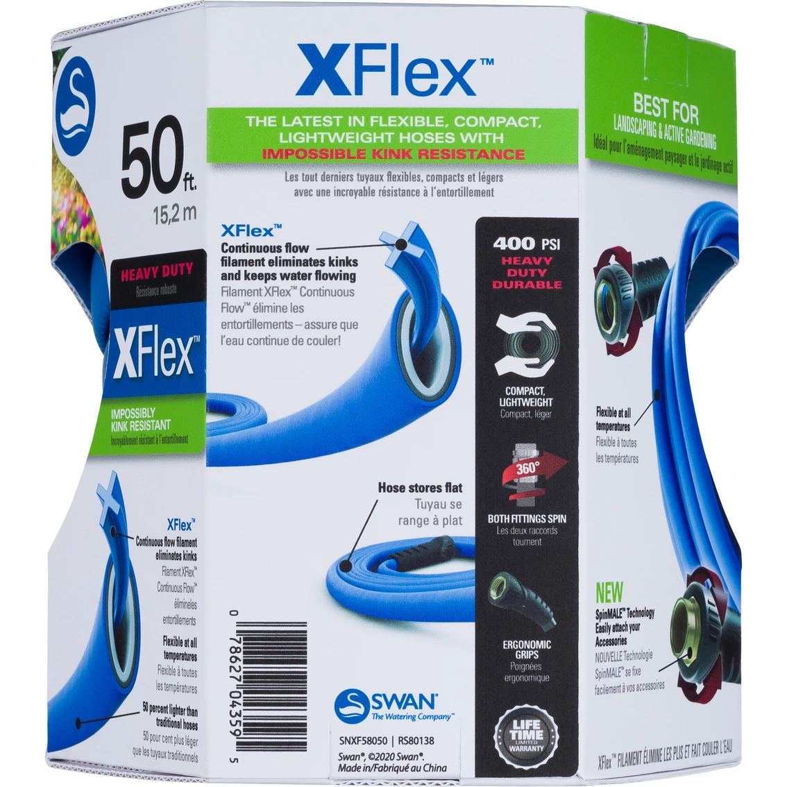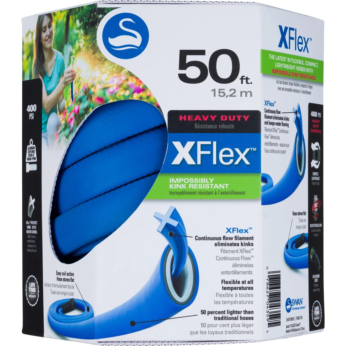 From the innovation experts at Swan comes the XFlex, a truly revolutionary garden hose that combines all the most sought-after features in garden hose functionality. From lightweight and long-lasting to kink-resistant, its the perfect water hose for the landscaper and active home gardener. Patent pending X-FLO kink proof technology makes hose impossible to kink — XFLO fiber prevents the stoppage of water flow and allows water pressure to open up any folds or kinks. Ultra lightweight, rugged performance. Flexible at all temps. Ergonomic female and male grips makes attachment quick and easy. Lifetime warranty. Made in the USA. Model: CSNXF58050.